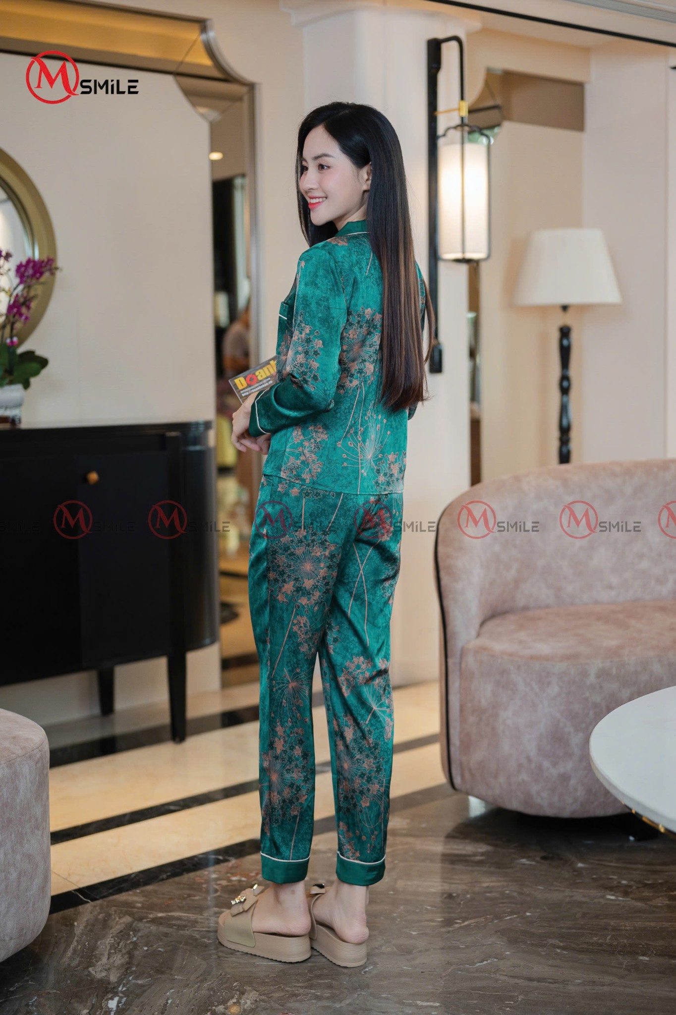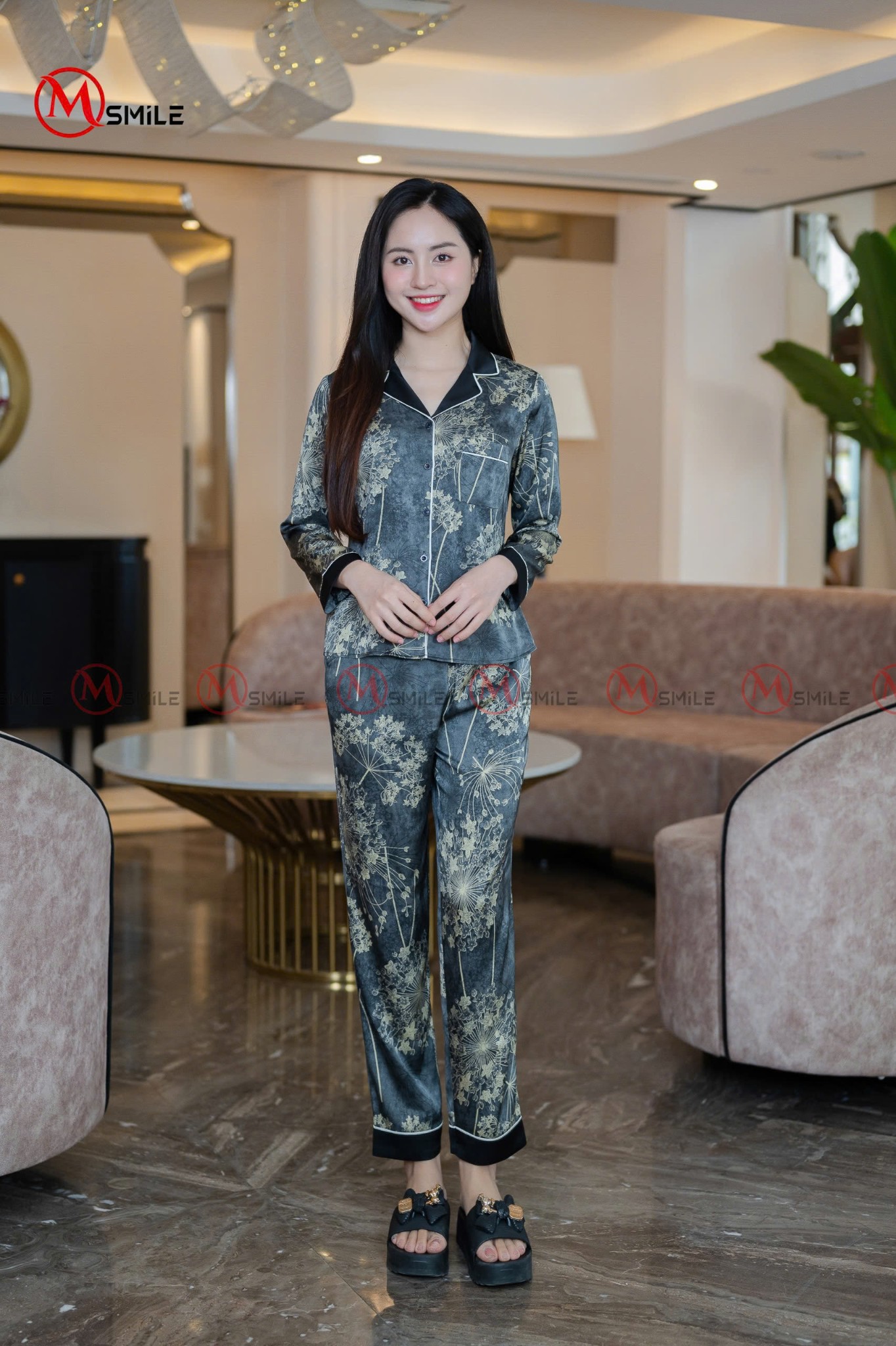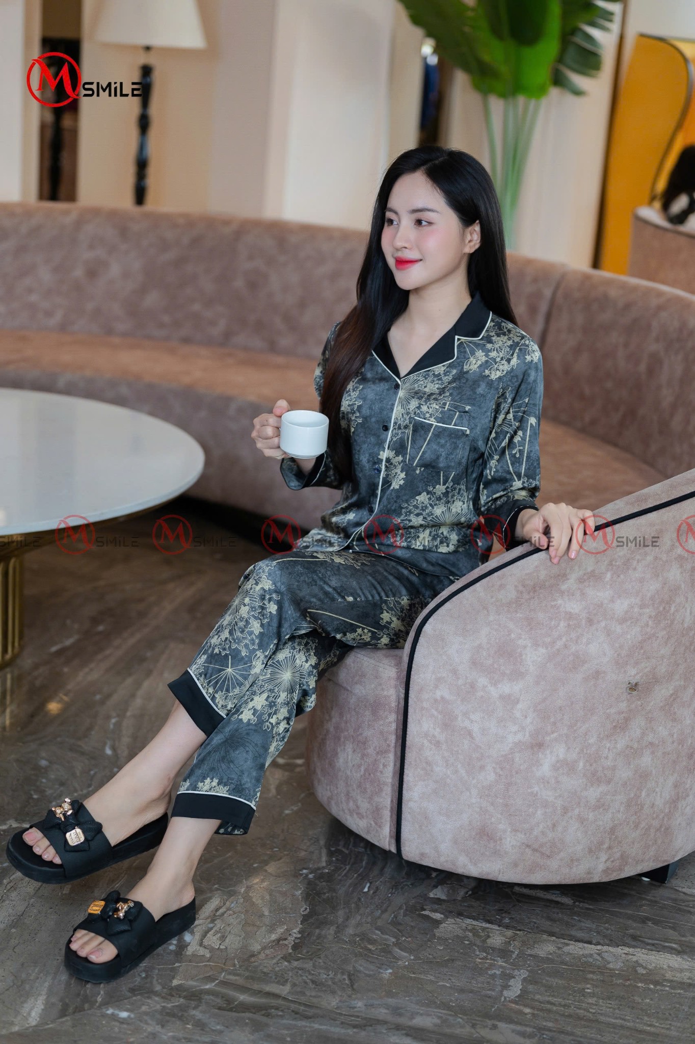 Thiết kế với dáng áo dài tay kết hợp quần dài mang đến sự kín đáo, thanh lịch nhưng vẫn đảm bảo sự thoải mái cho những khoảnh khắc thư giãn tại nhà. Phần cổ áo hai ve phối lé cùng đường viền tay và gấu quần được may chỉn chu, nhấn mạnh nét thanh thoát và hiện đại.