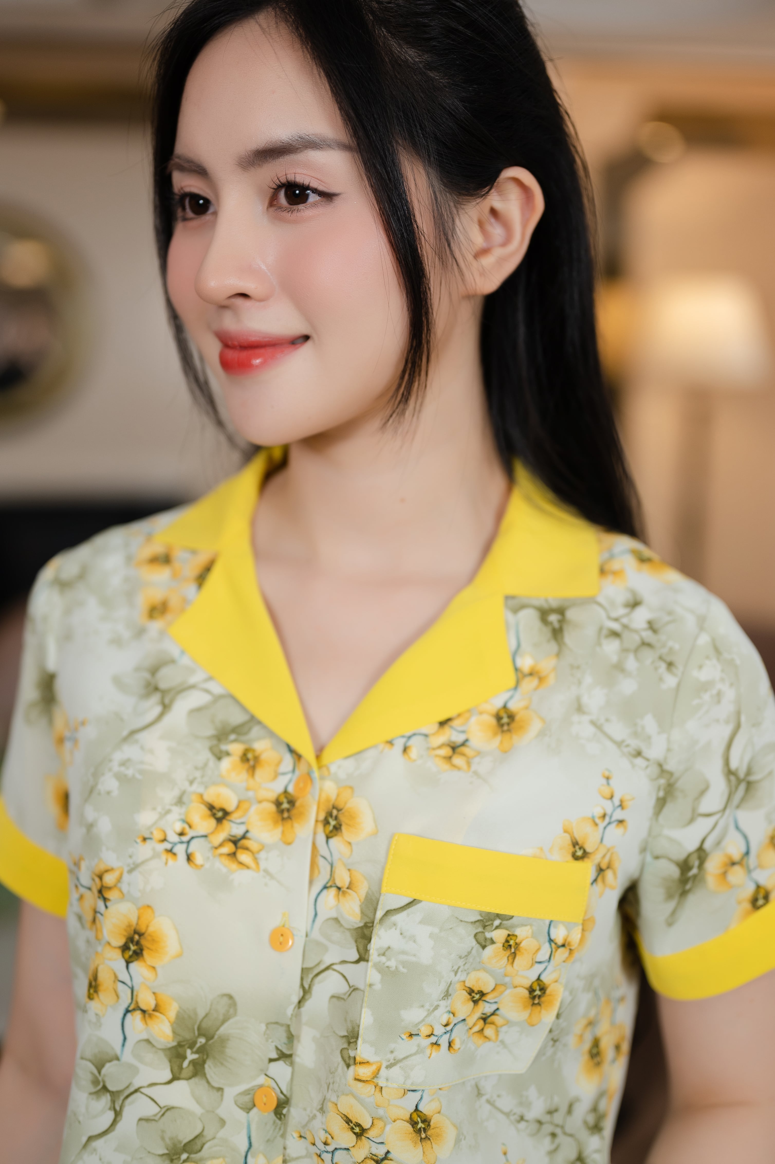 Chất liệu lụa satin cao cấp tạo cảm giác mềm mịn, mát lạnh khi chạm vào và cực kỳ thoáng khí. Bề mặt vải nhẹ bóng, giúp tổng thể bộ đồ thêm phần thanh lịch, tôn da và dễ dàng nâng tầm gu mặc nhà thường ngày. Thiết kế cổ hai ve phối màu tương phản tinh tế tạo điểm nhấn ở phần trên, đồng thời tôn dáng gương mặt một cách tự nhiên.